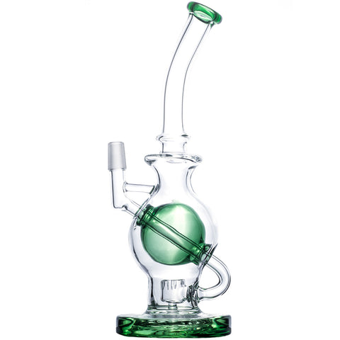 This classic inline designed dab rig is one of the favorites in our office. It stands for around 10"/25mm tall and the base is around 2.5"/6 cm wide and the most eye-catching feature of this wax rig is, of course, the giant ball sitting right in the middle! If you look closely you can find that the tube that connects to the14mm male joint and the cage percolator goes right through the ball, the ball itself doesn't contain any water in it.