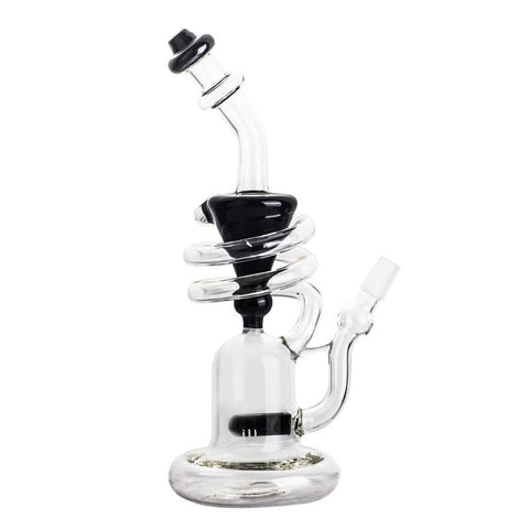 This borosilicate glass water pipe is 9.8" in height and the base is around 3.54" in width, for a rather tall bong it's quite slim, the most noticeable feature of the bong is the recycler structure. The twisted tube of this bong is great for eliminating splash and providing an excellent cool smoke.