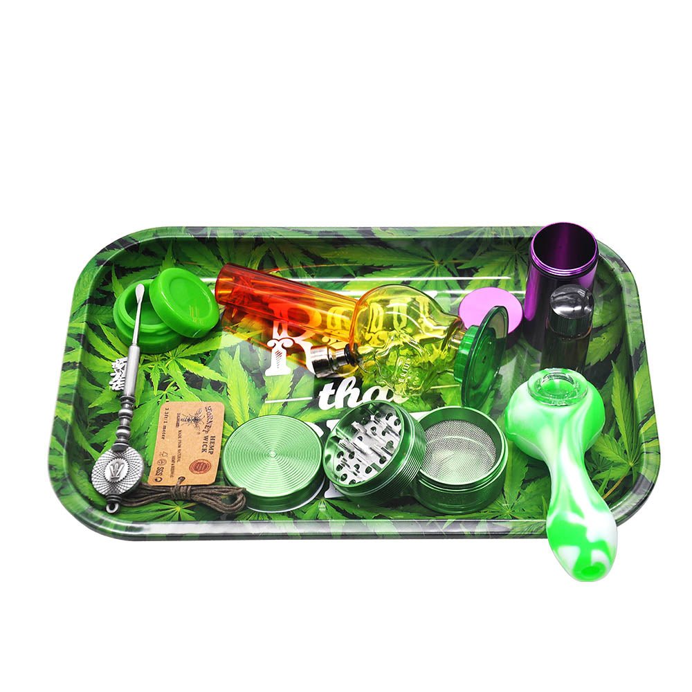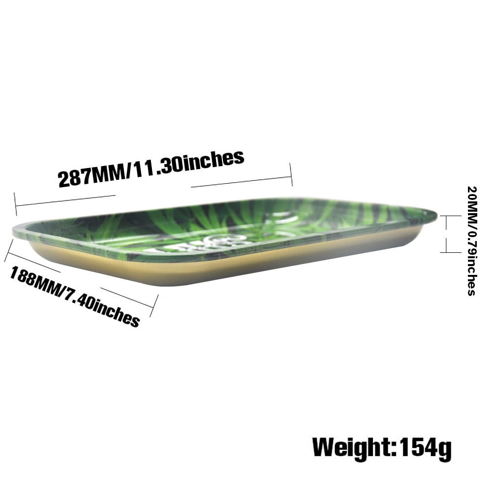This Hornet medium size metal rolling tray features a weed leaves background with letters "roll that shit", and for the price, it's pretty well-made and the size is large enough to put a grinder and a booklet of rolling papers on.